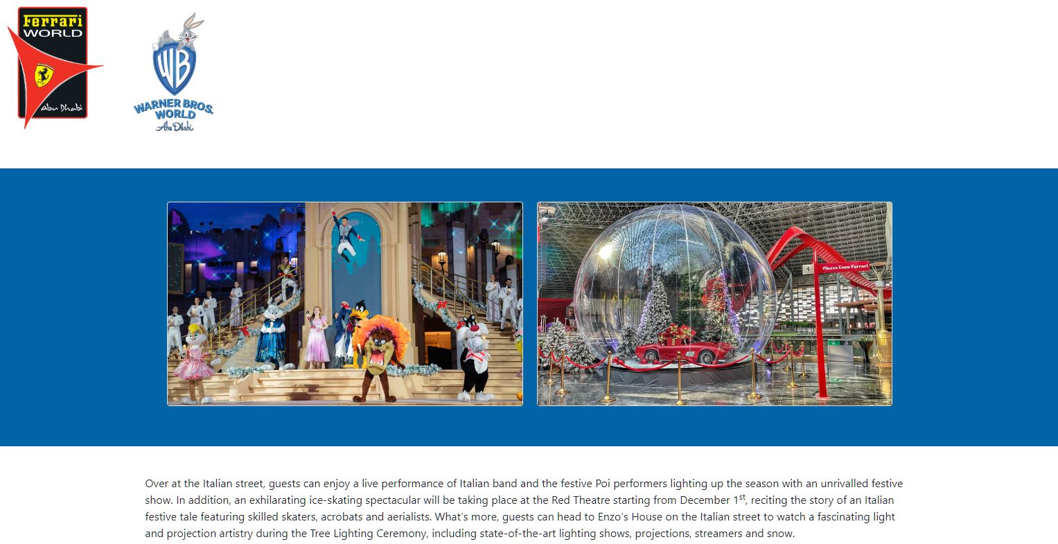 Gli attesissimi eventi dell'anno delizieranno gli ospiti e i visitatori delle attrazioni di classe mondiale di Yas Island Abu Dhabi, intrattenendo i frequentatori del parco con le più grandi celebrazioni festive e spettacoli abbaglianti, diffondendo l'allegria delle feste con nuovi incontri e saluti con i personaggi e spettacoli festivi destinati a stupire.