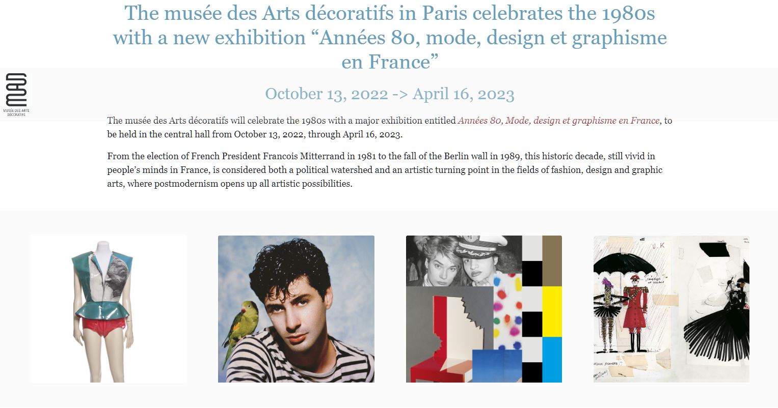 Il Musée des Arts décoratifs celebra gli anni 80 con una grande esposizione che si terrà dal 13 ottobre 2022 al 16 aprile 2023 Questo decennio storico, che va dall’elezione di François Mitterand nel 1981 fino alla caduta del muro di Berlino nel 1989, risuona in Francia come un punto di svolta al contempo politico e artistico nel mondo della moda, del design e della grafica.