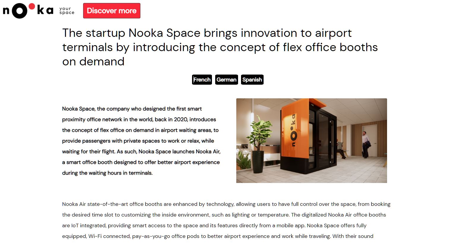 Nooka Space, l'azienda che ha progettato la prima rete di uffici intelligenti di prossimità al mondo, già nel 2020, introduce il concetto di ufficio flessibile su richiesta nelle aree di attesa degli aeroporti, per fornire ai passeggeri spazi privati per lavorare o rilassarsi, mentre aspettano il loro volo. Nooka Space lancia quindi Nooka Air, una cabina per ufficio intelligente progettata per offrire una migliore esperienza aeroportuale durante le ore di attesa nei terminal.